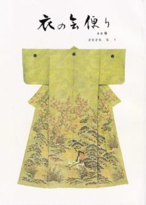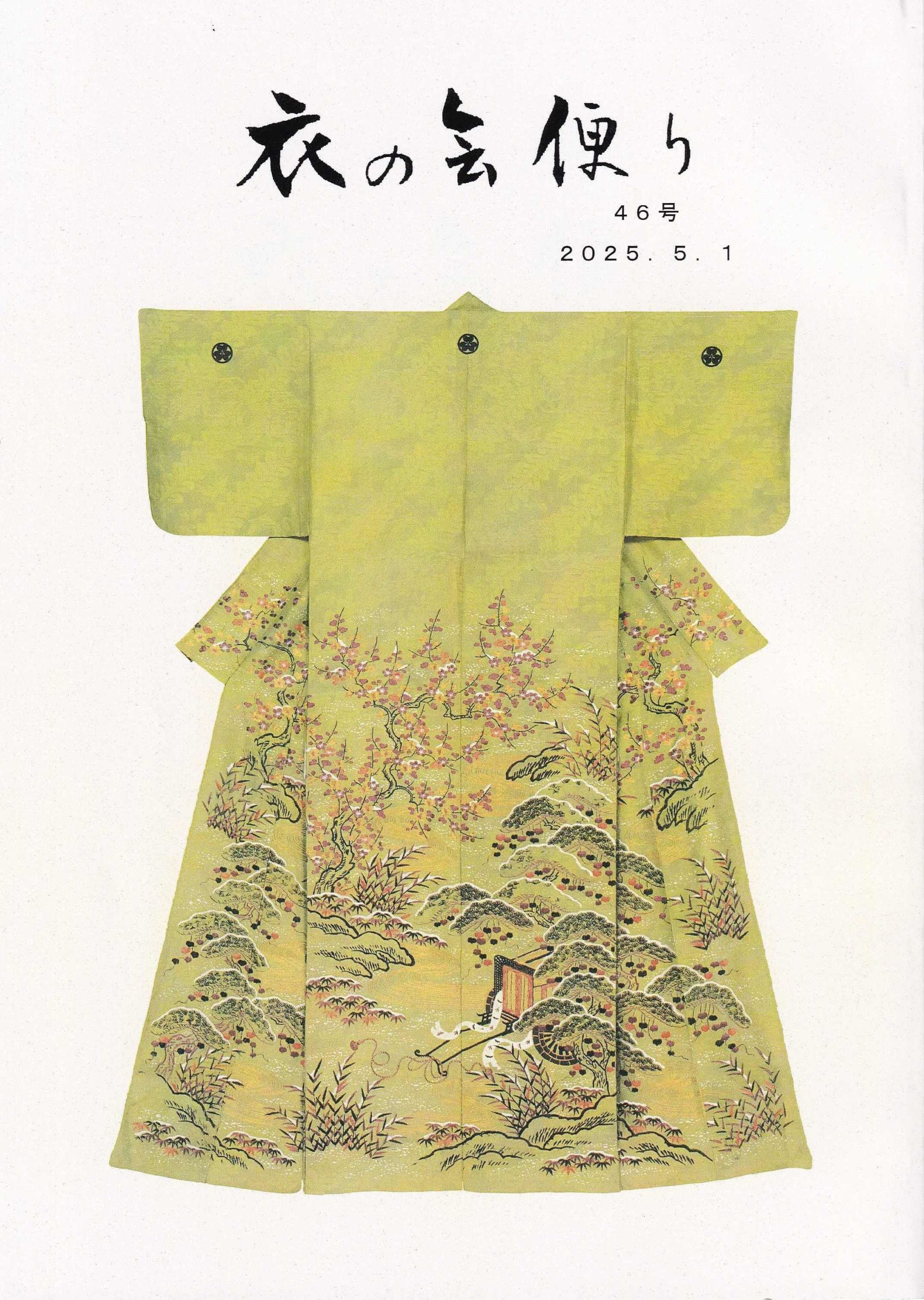 令和7年5月1日付の衣の会便り46号は5月19日に配布されました 内容は研究科、上級、初級の全会員のエッセイ、有志によるミニ知識 特別講義などです。 表紙の着物は青梅着物博物館所蔵 萌黄絽地松竹梅流水御所車縫紋付小袖、 とても美しい色の夏の着物です。